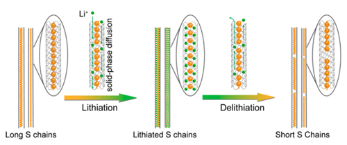 他们将一维的链状硫分子限制在碳纳米管中,成功制得了研究链状硫分子电化学性能的模型体系。通过系统深入的原位和半原位研究发现,碳纳米管限域的链状硫经历一种新奇的电化学反应过程,硫链在反应中缩短,电化学性能自发优化,而且反应接近于固相反应,从而有效避免了硫正极中间产物的溶出问题(图1)。