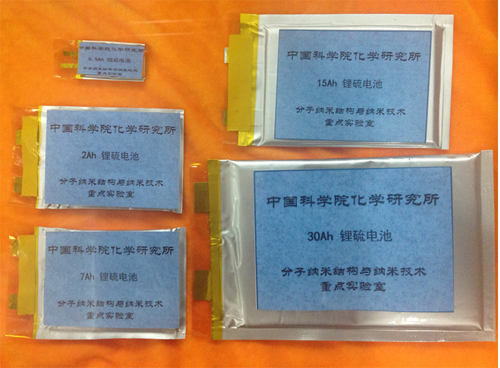 在上述基础研究的基础上,研究人员还着力于锂硫电池工程技术研发。在中国科学院战略性先导科技专项“变革性纳米制造产业技术聚焦”项目“长续航动力电池”的支持下,在化学所建立了锂硫软包电池组装线,锂硫软包电池的各项性能指标均取得了重要进展。目前可批量制备单体容量为0.5-30Ah的不同规格锂硫软包电池,其能量密度可达350-450Wh/kg,循环次数大于50次。相关锂硫软包电池已于9月3日至5日在北京召开的第六届中国国际纳米科学技术会议(ChinaNANO 2015)上展出(图3)。