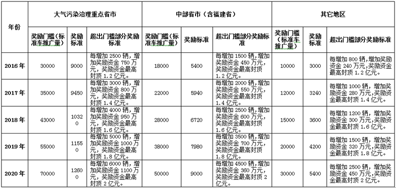 根据《通知》,新能源汽车充电基础设施奖励实行不同的奖励标准:对大气污染治理重点区域和重点省市(包括北京、上海、天津、河北、山西、江苏、浙江、山东、广东、海南),2016-2020年新能源汽车(标准车)推广数量分别不低于3.0万辆、3.5万辆、4.3万辆、5.5万辆、7万辆,且推广的新能源汽车数量占本地区新增及更新的汽车总量比例不低于2%、3%、4%、5%、6%。
