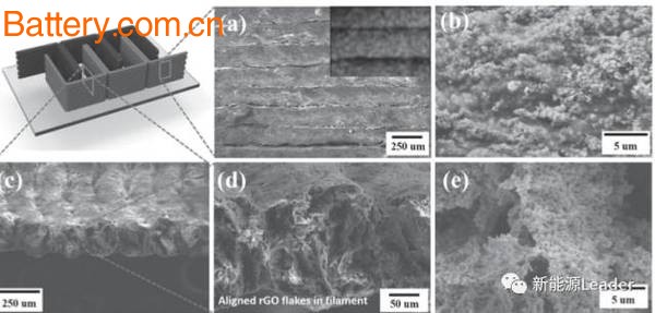 Kun Fu设计的电池,正负极分别采用了磷酸铁锂LFP和钛酸锂LTO,打印过程是通过喷嘴首先喷出细丝,根据设定好的程序一层一层的铺在基板上,然后采用冷冻干燥,以除去其中的水分和固化结构,然后经过热处理,使氧化石墨烯GO转变为还原石墨烯,最后在正负极之间的间隙内填入聚合物电解质,就完成了3D打印电池的制作。在电极中,由于剪切力的作用氧化石墨烯GO呈现出规则排列,增强了电子导电性,此外氧化石墨烯GO的多孔结构也为LFO或者LTO和电解液提供了大量的附着点。