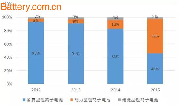 2012-2015年我国锂离子电池应用领域变化情况