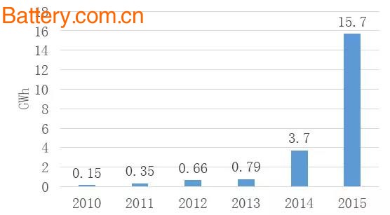 2014年以来,随着新能源汽车产量的快速提升,车用锂动力电池的需求持续爆发,据高工锂电数据显示,2015年我国动力电池出货量达到15.7GWh,同比增长3.24倍。从近5年的出货量趋势来看,2014年以前动力电池出货量一直低于1GWh,2014年首次突破了3GWh,市场开始进入爆发期,这与我国新能源汽车市场的发展趋势密切相关。
