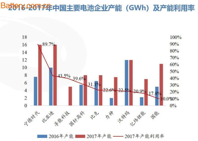 中国电动汽车百人会《锂电池产业发展报告》(2018)显示,2017年,动力电池产能利用率排名全国前九位的企业中,除了宁德时代一家独大,达到89.7%,只有比亚迪和孚能科技分别高于和接近40%,其余企业的产能利用率均远低于40%的水平。